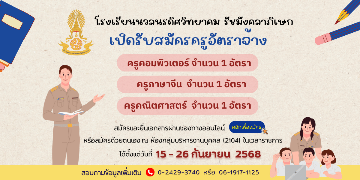 ประกาศโรงเรียนนวลนรดิศวิทยาคม รัชมังคลาภิเษก เรื่อง รับสมัครและสอบคัดเลือกลูกจ้างชั่วคราว ตำแหน่งครูผู้สอนคอมพิวเตอร์ ครูผู้สอนภาษาจีน และครูผู้สอนคณิตศาสตร์