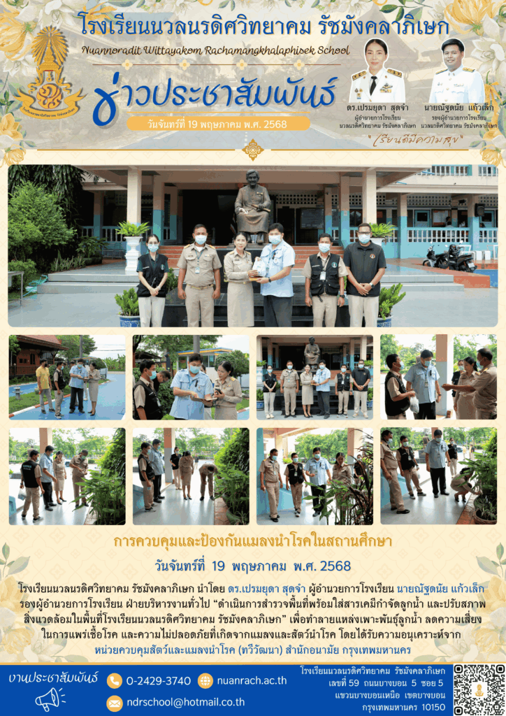 ✨ นำโดย ดร.เปรมยุดา สุดจำ ผู้อำนวยการโรงเรียน นายณัฐดนัย แก้วเล็ก รองผู้อำนวยการโรงเรียน ฝ่ายบริหารงานทั่วไป “ดำเนินการสำรวจพื้นที่พร้อมใส่สารเคมีกำจัดลูกน้ำ และปรับสภาพสิ่งแวดล้อมในพื้นที่โรงเรียนนวลนรดิศวิทยาคม รัชมังคลาภิเษก” เพื่อทำลายแหล่งเพาะพันธุ์ลูกน้ำ ลดความเสี่ยงในการแพร่เชื้อโรค และความไม่ปลอดภัยที่เกิดจากแมลงและสัตว์นำโรค โดยได้รับความอนุเคราะห์จาก หน่วยควบคุมสัตว์และแมลงนำโรค (ทวีวัฒนา) สำนักอนามัย กรุงเทพมหานคร