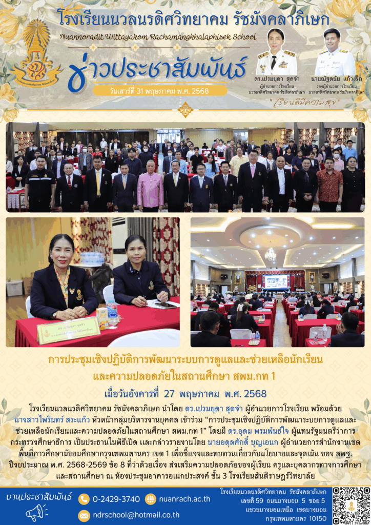 ✨ นำโดย ดร.เปรมยุดา สุดจำ ผู้อำนวยการโรงเรียน พร้อมด้วย นางสาวไพรินทร์ สระแก้ว หัวหน้ากลุ่มบริหารงานบุคคล เข้าร่วม “การประชุมเชิงปฏิบัติการพัฒนาระบบการดูแลและช่วยเหลือนักเรียนและความปลอดภัยในสถานศึกษา สพม.กท 1” โดยมี ดร.อุดม พรมพันธ์ใจ ผู้แทนรัฐมนตรีว่าการกระทรวงศึกษาธิการ เป็นประธานในพิธีเปิด เเละกล่าวรายงานโดย นายอดุลศักดิ์ บุญเอนก ผู้อำนวยการสำนักงานเขตพื้นที่การศึกษามัธยมศึกษากรุงเทพมหานคร เขต 1 เพื่อชี้แจงและทบทวนเกี่ยวกับนโยบายและจุดเน้น ของ สพฐ. ปีงบประมาณ พ.ศ. 2568-2569 ข้อ 8 ที่ว่าด้วยเรื่อง ส่งเสริมความปลอดภัยของผู้เรียน ครูและบุคลากรทางการศึกษา และสถานศึกษา