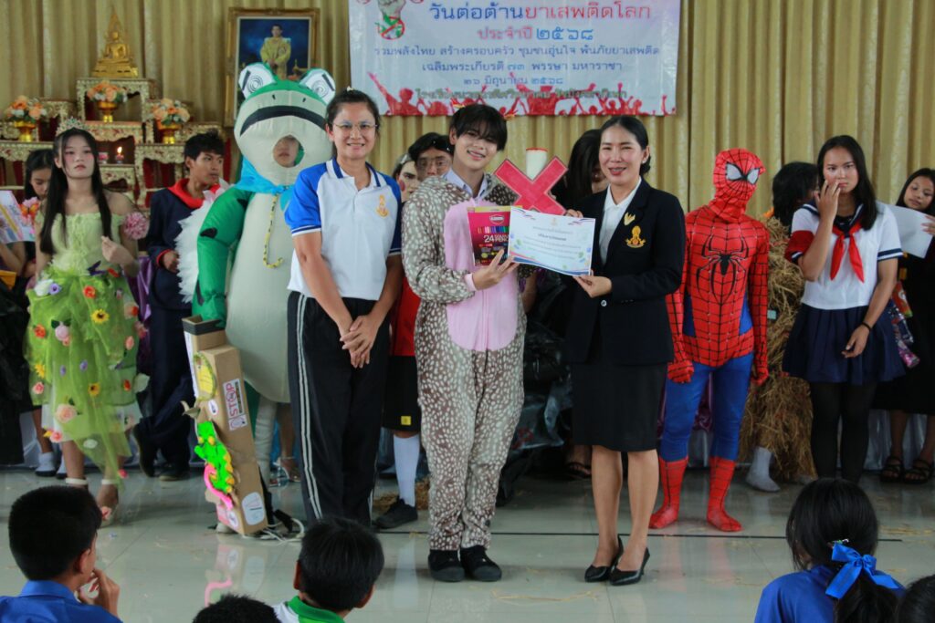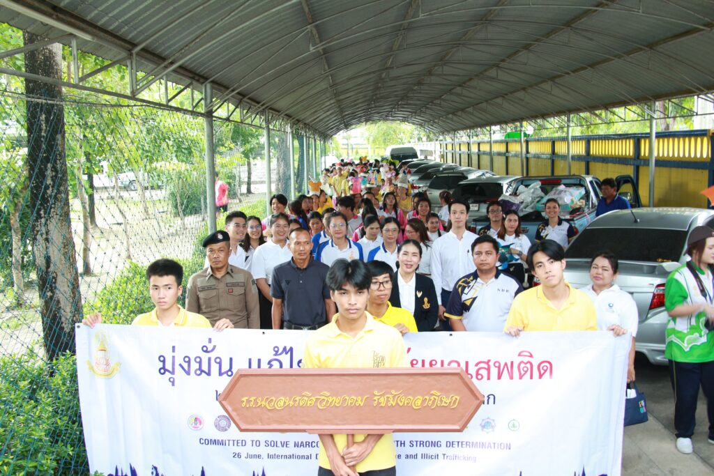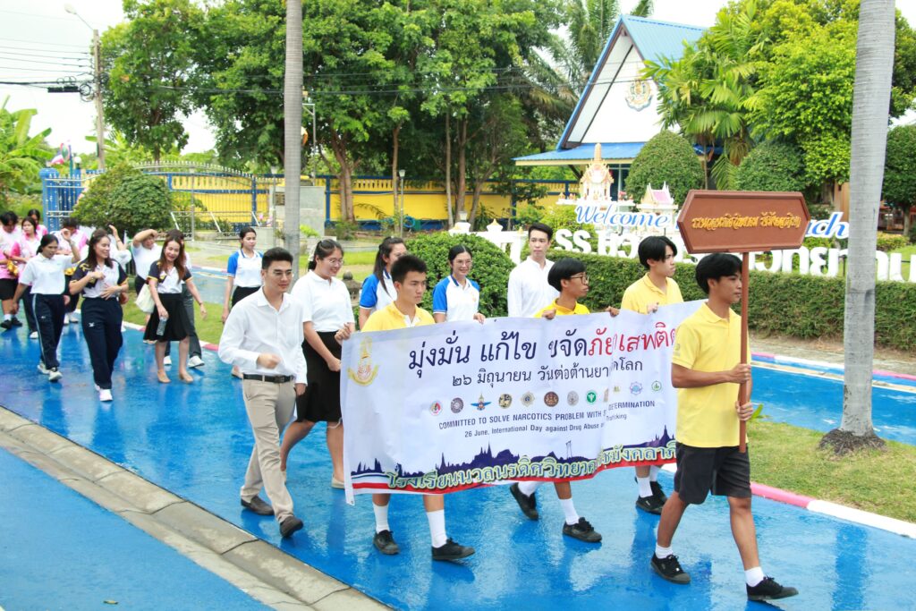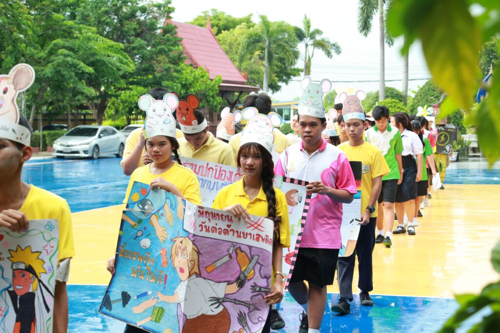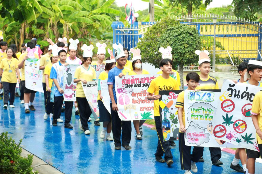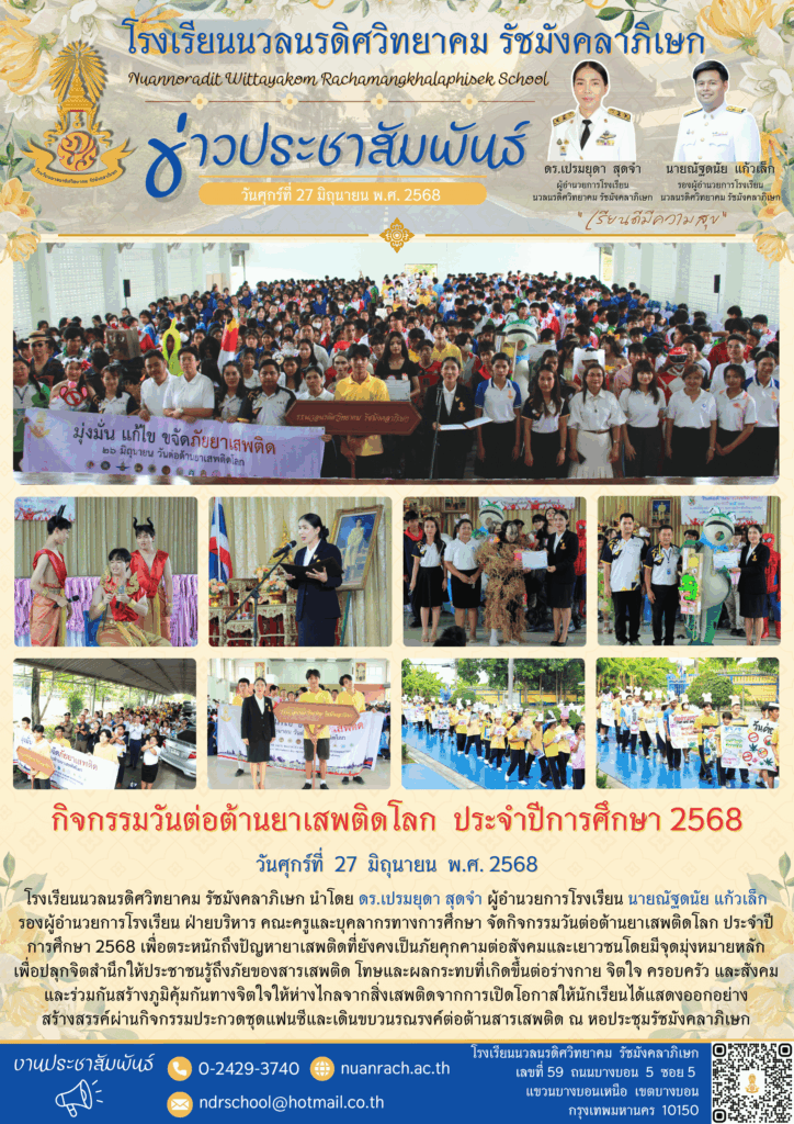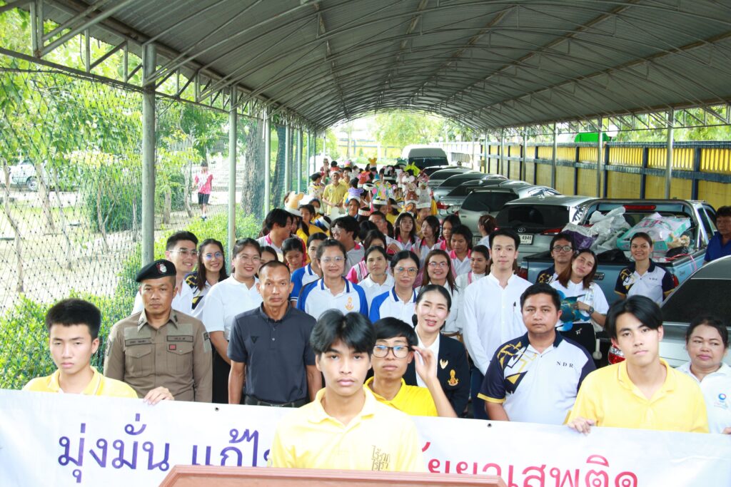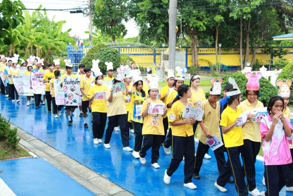 ✨ นำโดย ดร.เปรมยุดา สุดจำ ผู้อำนวยการโรงเรียน นายณัฐดนัย แก้วเล็ก รองผู้อำนวยการโรงเรียน ฝ่ายบริหาร คณะครูและบุคลากรทางการศึกษา จัดกิจกรรมวันต่อต้านยาเสพติดโลก ประจำปีการศึกษา 2568 เพื่อตระหนักถึงปัญหายาเสพติดที่ยังคงเป็นภัยคุกคามต่อสังคมและเยาวชนโดยมีจุดมุ่งหมายหลักเพื่อปลุกจิตสำนึกให้ประชาชนรู้ถึงภัยของสารเสพติด โทษและผลกระทบที่เกิดขึ้นต่อร่างกาย จิตใจ ครอบครัว และสังคม และร่วมกันสร้างภูมิคุ้มกันทางจิตใจให้ห่างไกลจากสิ่งเสพติดจากการเปิดโอกาสให้นักเรียนได้แสดงออกอย่างสร้างสรรค์ผ่านกิจกรรมประกวดชุดแฟนซีและเดินขบวนรณรงค์ต่อต้านสารเสพติด