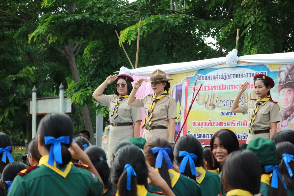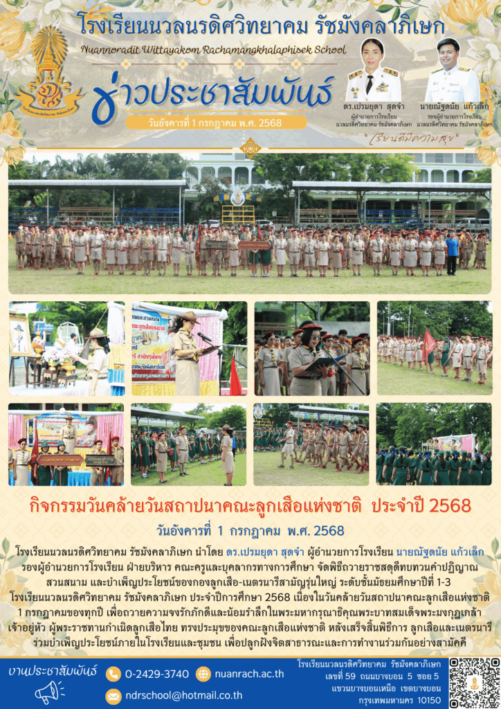 ✨ นำโดย ดร.เปรมยุดา สุดจำ ผู้อำนวยการโรงเรียน นายณัฐดนัย แก้วเล็ก รองผู้อำนวยการโรงเรียน ฝ่ายบริหาร คณะครูและบุคลากรทางการศึกษา จัดพิธีถวายราชสดุดีทบทวนคำปฏิญาณสวนสนาม และบำเพ็ญประโยชน์ของกองลูกเสือ-เนตรนารีสามัญรุ่นใหญ่ ระดับชั้นมัธยมศึกษาปีที่ 1-3 โรงเรียนนวลนรดิศวิทยาคม รัชมังคลาภิเษก ประจำปีการศึกษา 2568 เนื่องในวันคล้ายวันสถาปนาคณะลูกเสือแห่งชาติ 1 กรกฎาคมของทุกปี เพื่อถวายความจงรักภักดีและน้อมรำลึกในพระมหากรุณาธิคุณพระบาทสมเด็จพระมงกุฎเกล้าเจ้าอยู่หัว ผู้พระราชทานกำเนิดลูกเสือไทย ทรงประมุขของคณะลูกเสือแห่งชาติ หลังเสร็จสิ้นพิธีการ ลูกเสือและเนตรนารี ร่วมบำเพ็ญประโยชน์ภายในโรงเรียนและชุมชน เพื่อปลูกฝังจิตสาธารณะและการทำงานร่วมกันอย่างสามัคคี