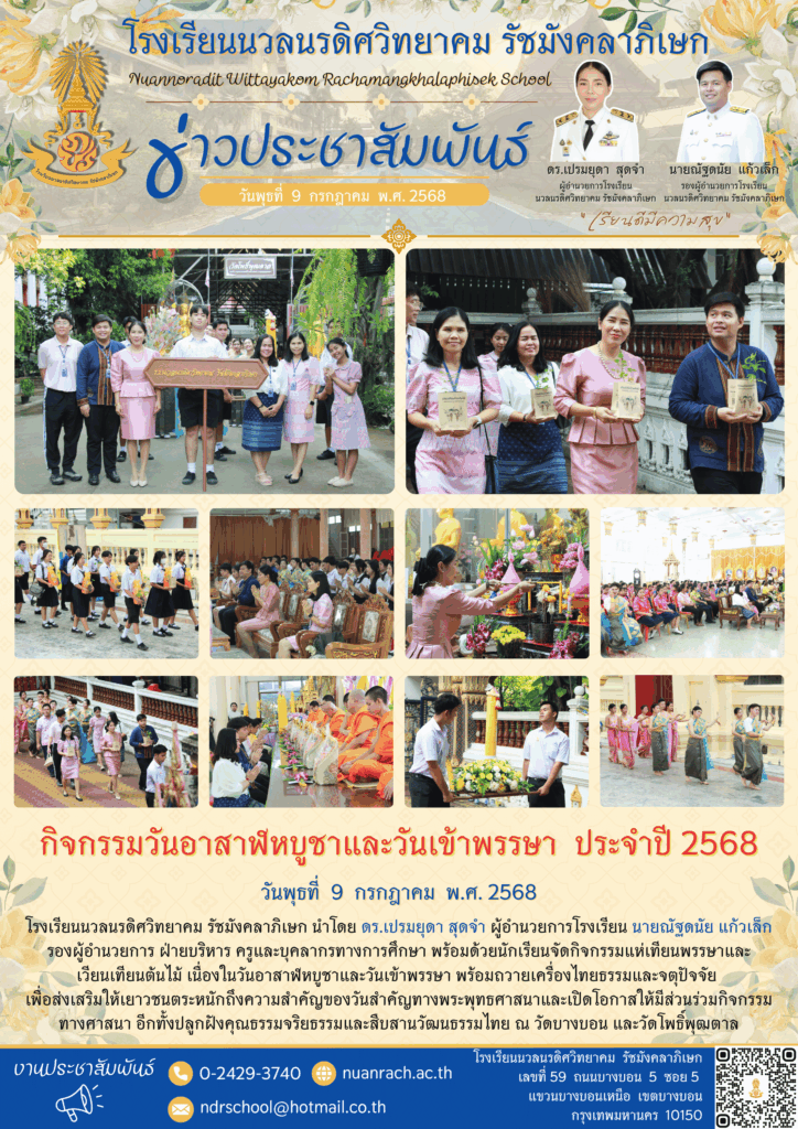 ✨ นำโดย ดร.เปรมยุดา สุดจำ ผู้อำนวยการโรงเรียน นายณัฐดนัย แก้วเล็ก รองผู้อำนวยการโรงเรียน ฝ่ายบริหาร คณะครูและบุคลากรทางการศึกษา พร้อมด้วยนักเรียนจัดกิจกรรมแห่เทียนพรรษาและเวียนเทียนต้นไม้ เนื่องในวันอาสาฬหบูชาและวันเข้าพรรษา พร้อมถวายเครื่องไทยธรรมและจตุปัจจัย เพื่อส่งเสริมให้เยาวชนตระหนักถึงความสำคัญของวันสำคัญทางพระพุทธศาสนาและเปิดโอกาสให้มีส่วนร่วมกิจกรรมทางศาสนา อีกทั้งปลูกฝังคุณธรรมจริยธรรมและสืบสานวัฒนธรรมไทย