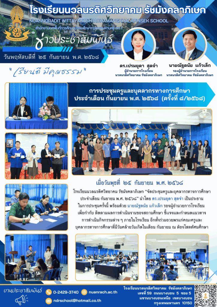 ✨ จัดประชุมครูและบุคลากรทางการศึกษา ประจำเดือน กันยายน พ.ศ. 2568 นำโดย ดร.เปรมยุดา สุดจำ เป็นประธาน ในการประชุมครั้งนี้ พร้อมด้วย นายณัฐดนัย แก้วเล็ก รองผู้อำนวยการโรงเรียน เพื่อกำกับ ติดตามผลการดำเนินงานของสถานศึกษา ชี้เเจงและกำหนดแนวทางการดำเนินกิจกรรมต่าง ๆ ภายในโรงเรียน อีกทั้งร่วมอวยพรแก่คณะครูและบุคลากรทางการศึกษาที่มีวันคล้ายวันเกิดในเดือน กันยายน