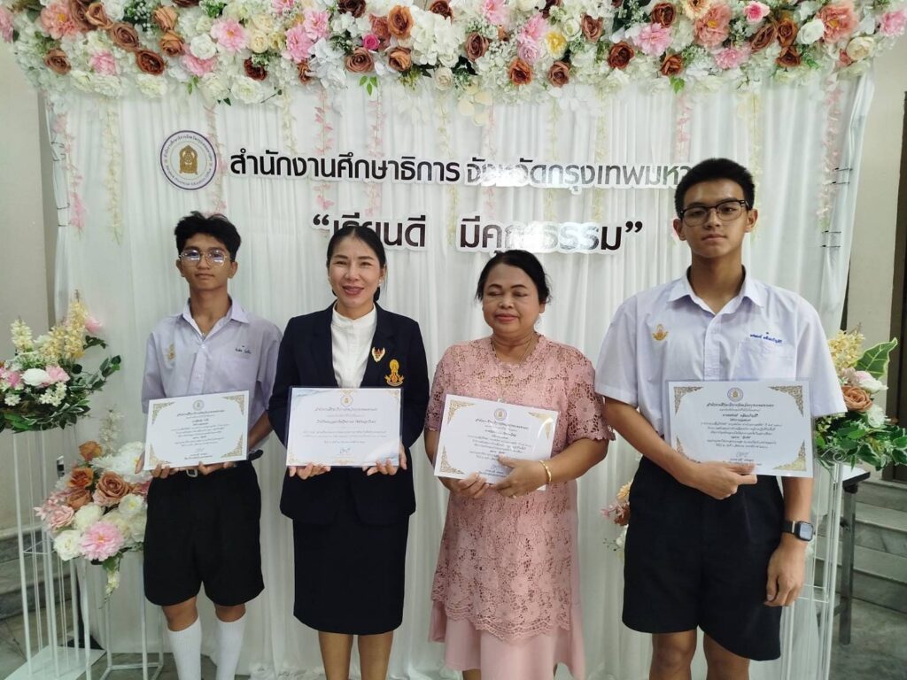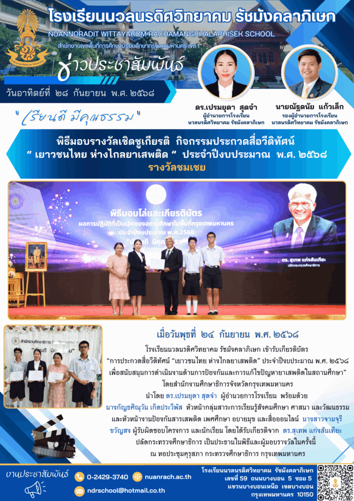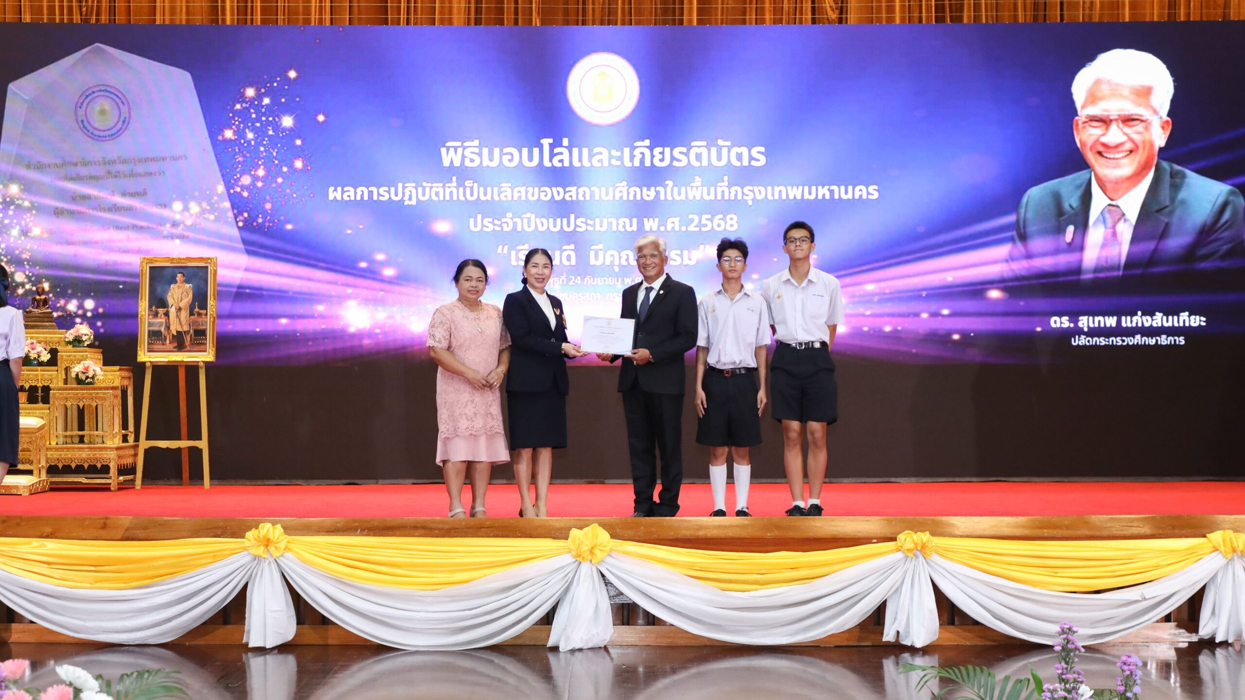 ✨ เข้ารับเกียรติบัตรการประกวดสื่อวีดิทัศน์ “เยาวชนไทย ห่างไกลยาเสพติด” ประจำปีงบประมาณ พ.ศ. 2568 เพื่อสนับสนุนการดำเนินงานด้านการป้องกันและการแก้ไขปัญหายาเสพติดในสถานศึกษา” โดยสำนักงานศึกษาธิการจังหวัดกรุงเทพมหานคร นำโดย ดร.เปรมยุดา สุดจำ ผู้อำนวยการโรงเรียน พร้อมด้วย นางกัญธศิณุวัน เกิดประวีพัส หัวหน้ากลุ่มสาระการเรียนรู้สังคมศึกษา ศาสนา และวัฒนธรรม และหัวหน้างานป้องกันสารเสพติด เพศศึกษา อบายมุข และสื่อออนไลน์ นางสาวจามจุรี ขวัญสง ผู้รับผิดชอบโครงการ และนักเรียน โดยได้รับเกียรติจาก ดร.สุเทพ แก่งสันเทียะ ปลัดกระทรวงศึกษาธิการ เป็นประธานในพิธีและผู้มอบรางวัลในครั้งนี้
